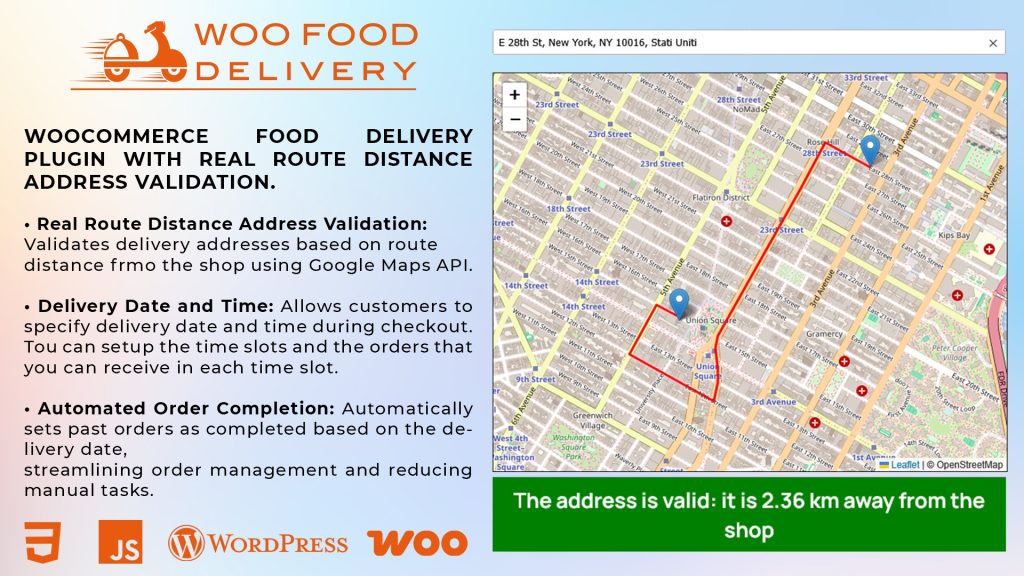 Woo Food Delivery is a WordPress plugin that transforms your WooCommerce store into a food delivery platform. It adds address validation with interactive maps, delivery date and time selection with configurable slots, distance-based delivery zones, and additional delivery fields (doorbell, floor, apartment). The plugin also includes minimum order amounts, allergen management, custom messages, and kitchen order PDFs to streamline your food delivery operations.
